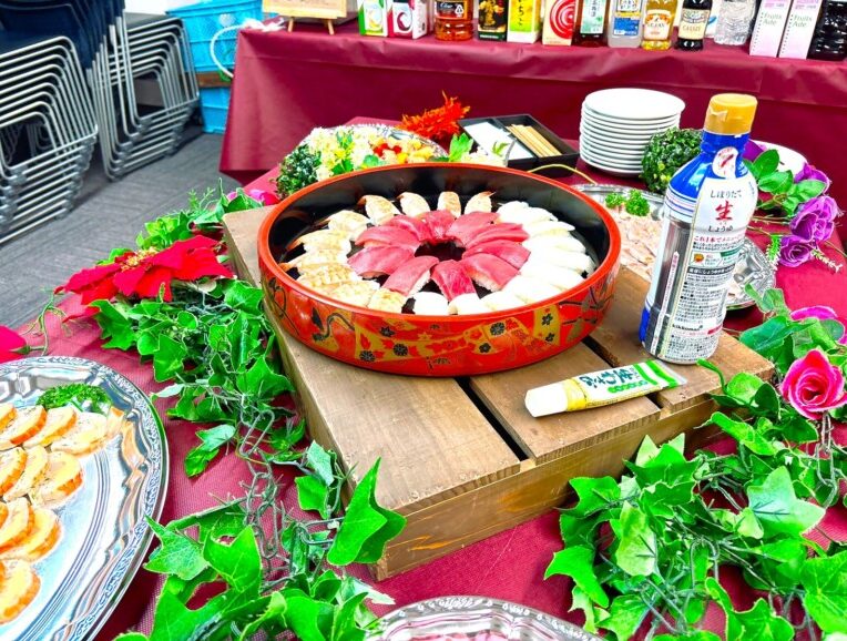 彩り豊かなフィンガーフードとお寿司 写真にもある通り、マグロや海老などのお寿司を美しく盛り付けてご提供。