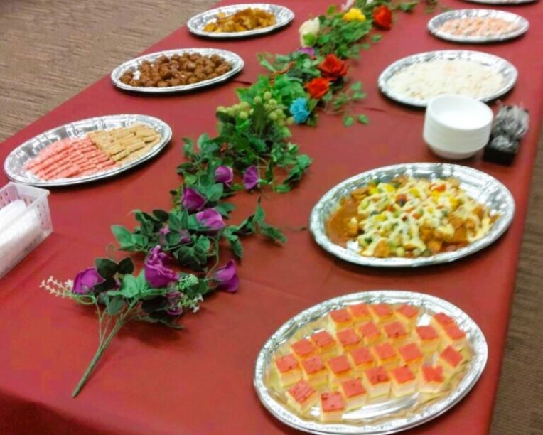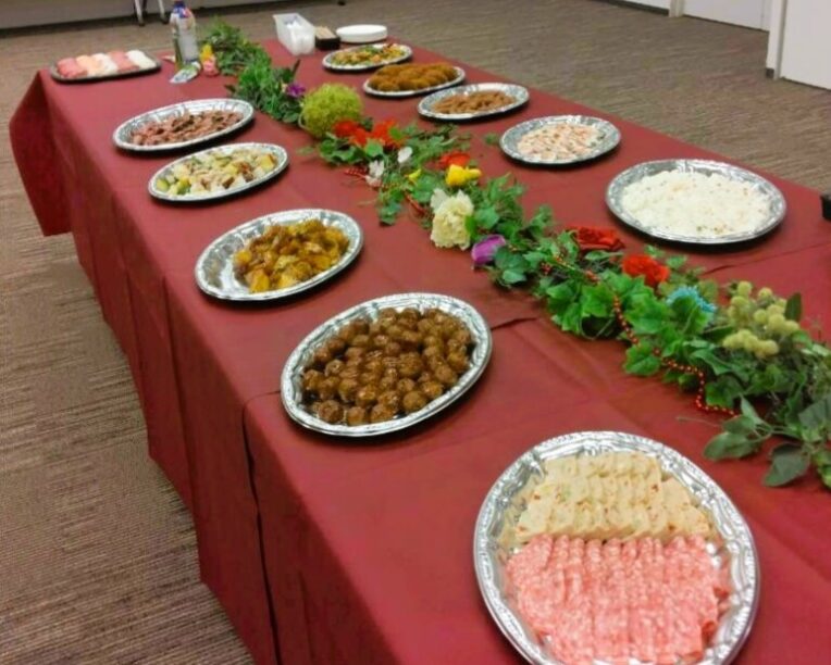 当日は、会場中央に長く設けられたテーブルに、彩り豊かなお料理をずらりと並べてご用意いたしました。赤いクロスの上に並ぶ料理と装飾のグリーンがとても華やかで、会場に入った瞬間からパーティーらしい特別な雰囲気を演出していました✨