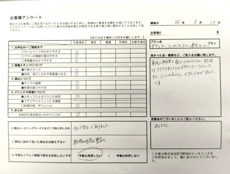 某部様、この度は大切な集まりに当店をお選びいただき、誠にありがとうございました。