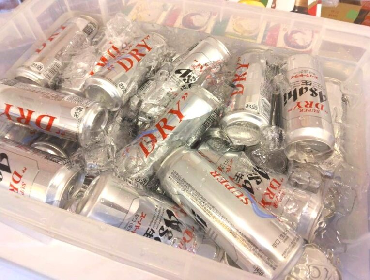 今回は、氷をたっぷり敷き詰めたクーラーボックスにアサヒスーパードライをぎっしりと準備。
