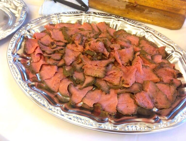 絶妙な火入れでピンク色に輝くお肉が目の前でスライスされるたび、食欲をそそる香りが会場に広がります。