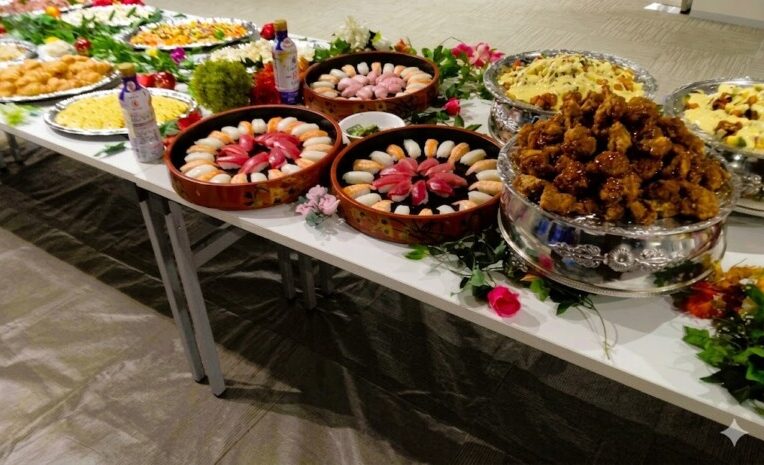 華やかに装飾されたテーブルには、和洋折衷の豪華な料理が並び、会場を一層華やかに演出いたしました。