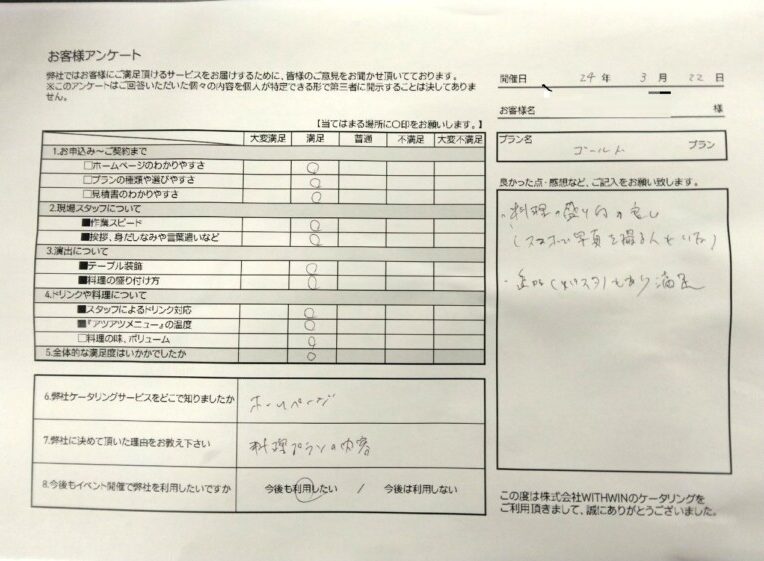 今回のアンケートでは、お料理の味はもちろんのこと、「ドリンクの対応が非常に早かった」「スタッフの動きが良くて助かった」という、